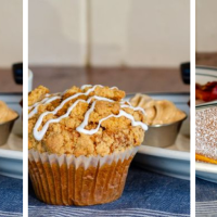Three of our signature griddlecakes: Strawberries & Cream, Grilled Peach, and Cinnamon Roll.