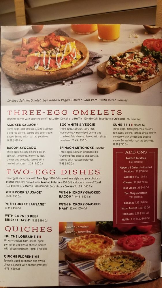 Egg, spinach, tomato, and onion filling topped with creamy mornay cheese sauce. Served with roasted potatoes.(654 Cal) $16.49 Add avocado $1.99