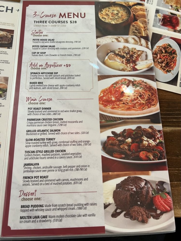 Made from scratch bread pudding with raisins, topped with whiskey sauce and whipped cream. (1060 Cal)